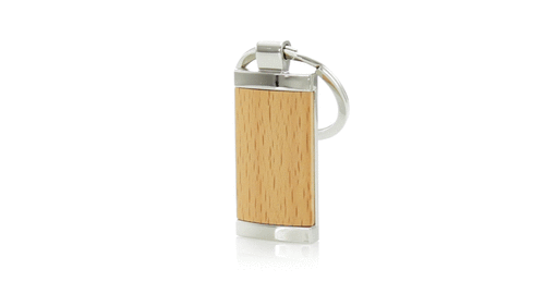 Llavero elegante con diseño en metal y madera natural, presentado en bolsita con refuerzo de cartón en color plateado. Disponible en forma circular o rectangular.